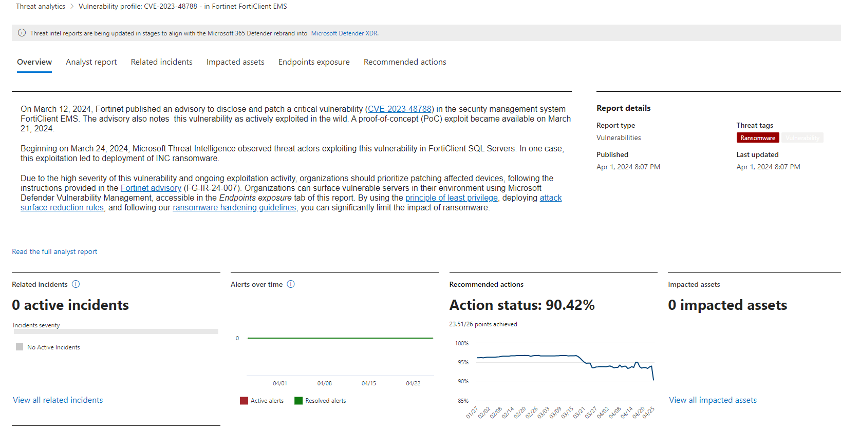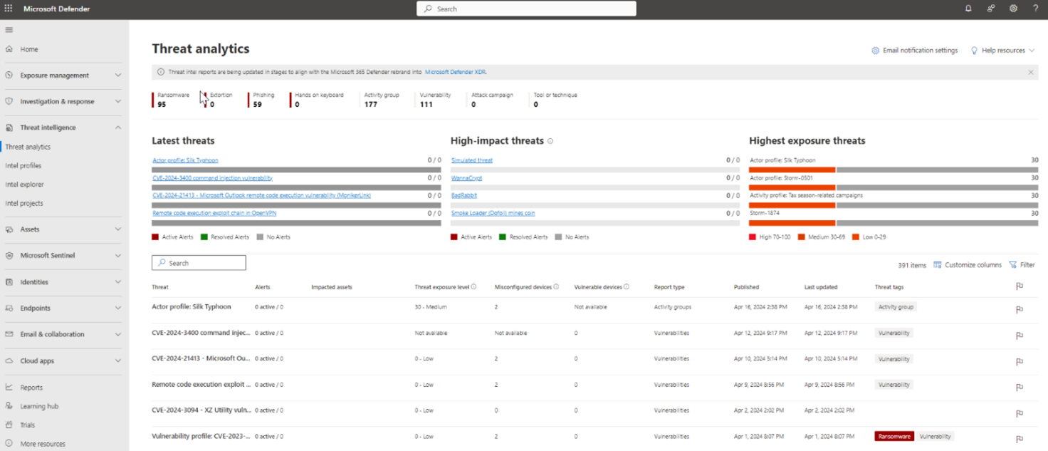 Threat analytics dashboard: This is a central place to view and manage threat analytics reports, which provide in-depth analysis and guidance on active and emerging threats, such as ransomware campaigns, phishing attacks, zero-day exploits, and nation-state actors. You can access the threat analytics dashboard from the Home page or the Threat analytics page in the Microsoft Defender portal. You can also filter the reports by category, severity, status, and tag. For each report, you can see the summary, details, scope, detection, and remediation sections, as well as related incidents, alerts, and indicators. You can also take actions such as adding tags, changing status, creating incidents, and applying custom detections.