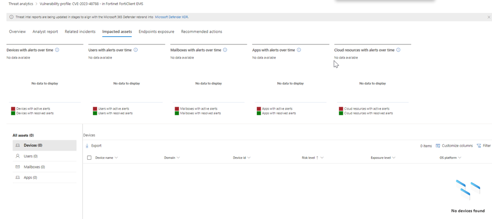 Use the Impacted Assets tab in the threat analytics reports to view a list of devices that have been affected by the threat or may be vulnerable to it.